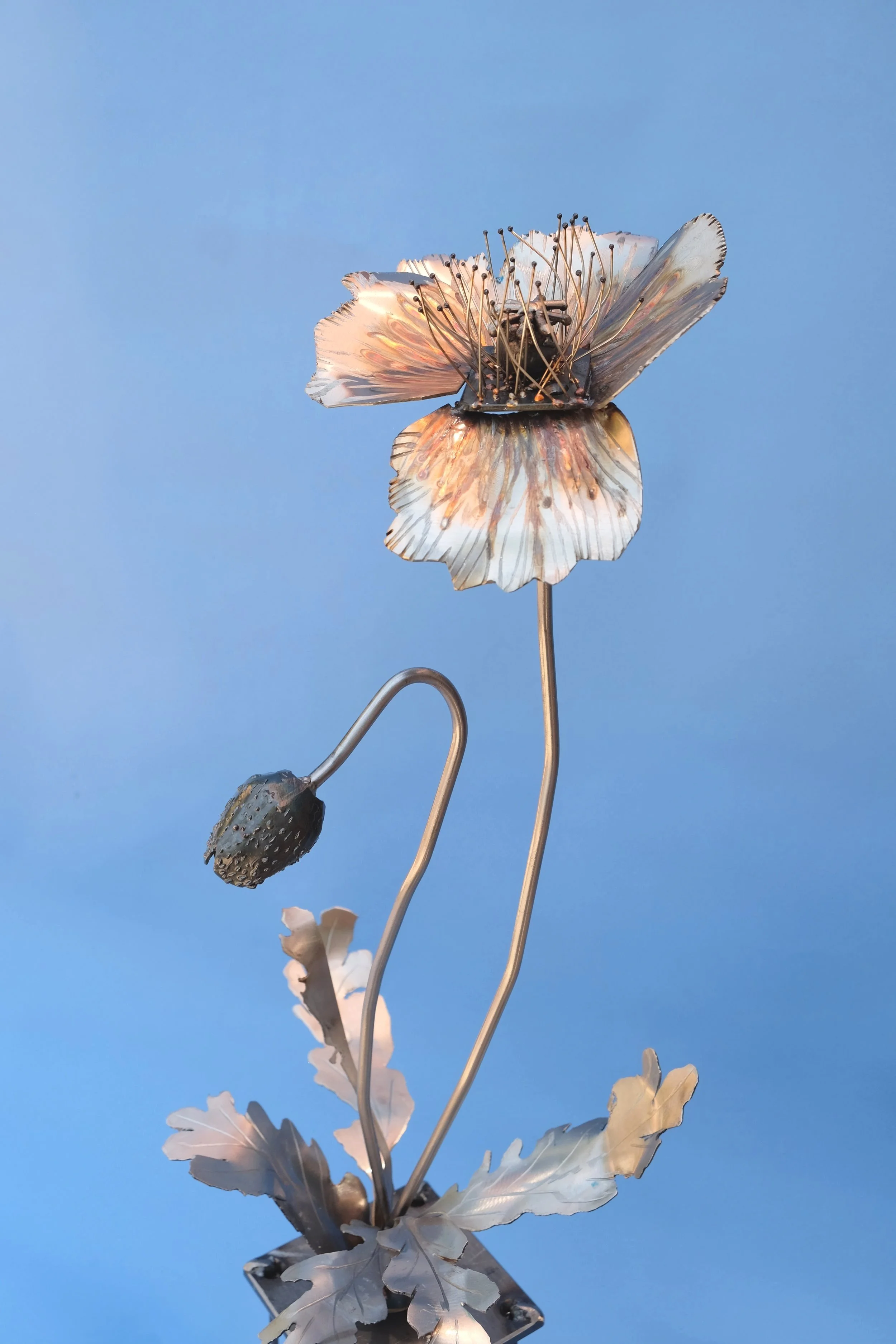 My mom has always loved Icelandic poppies, but they never were able to grow in her garden despite her efforts. For her birthday I made her a metal poppy that will can exist in her garden year round.
