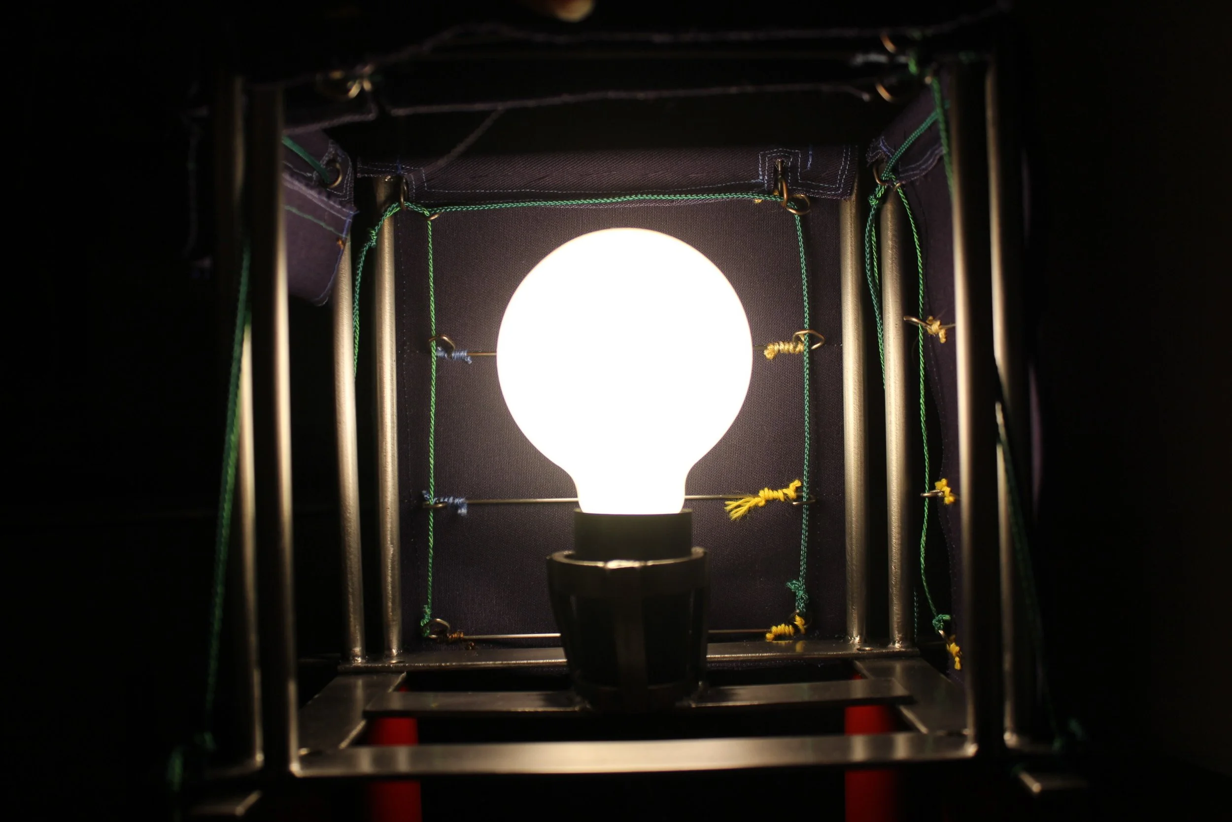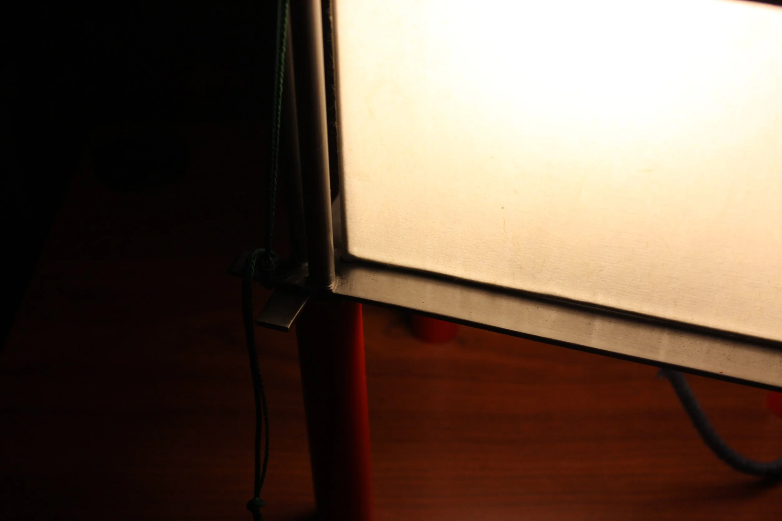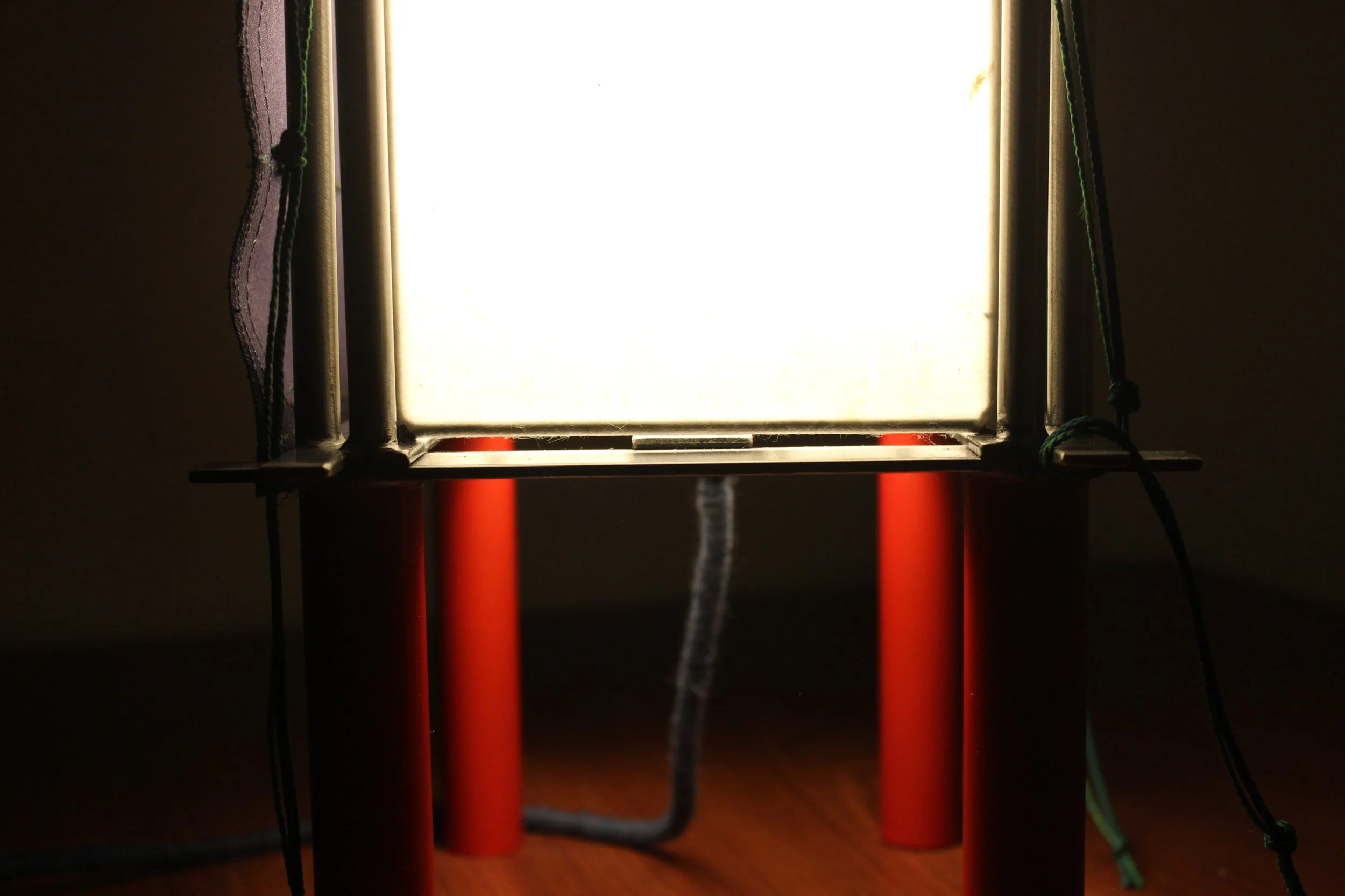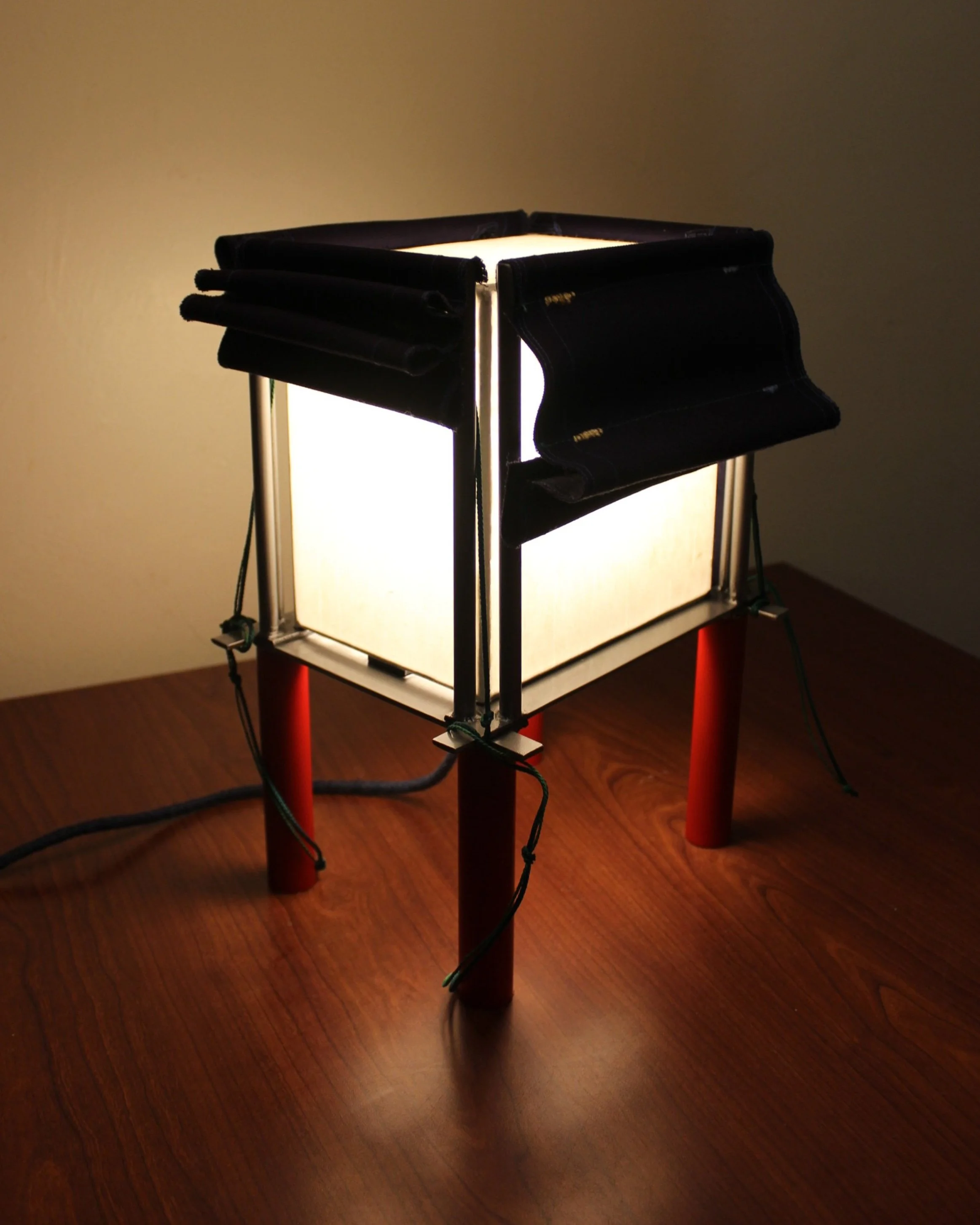 This lamp is surrounded by four roman shades. Intended for the user to draw the blinds and adjust the lighting as necessary. Maybe it is for a bedside table, where one person wants to sleep and the other wants to read. Its function is up to you! The paper lantern inside is removable so you are able to change the lightbulb when it is time.